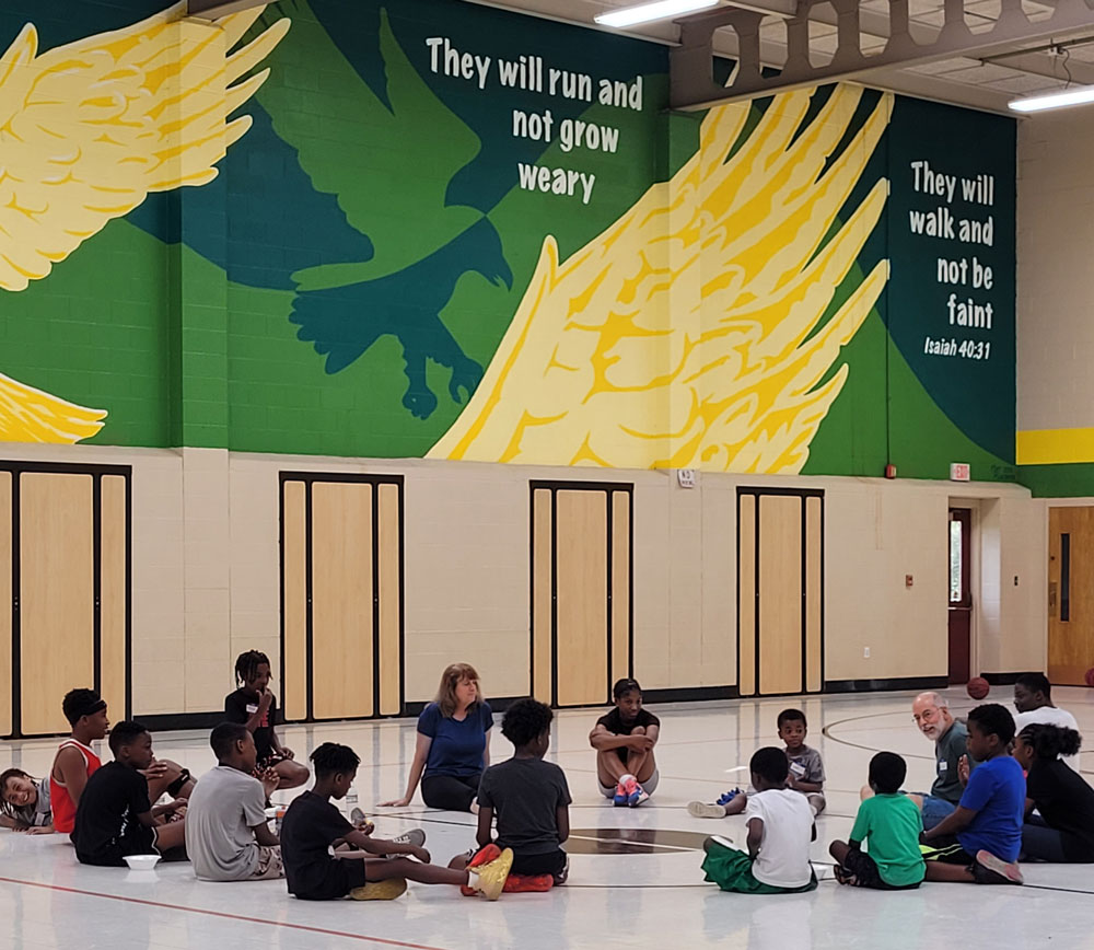 Open Gym, on Saturdays in July. We use our (air-conditioned!) school gymnasium to get energy out, spend time building relationships, and having a brief devotion.